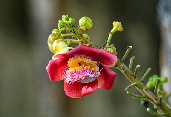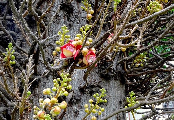 Inflorescências do tipo rácemo, com até 80 cm de comprimento que saem diretamente do tronco e ramos. As flores são grandes, com seis pétalas carnosas, esverdeadas, alaranjadas ou vermelhas e longos estames brancos, amarelos ou róseos com anteras amarelas. Elas exalam um delicado aroma de rosas. Surgem ao longo do ano, com mais intensidade na primavera/verão e atraem abelhas e mamangavas.