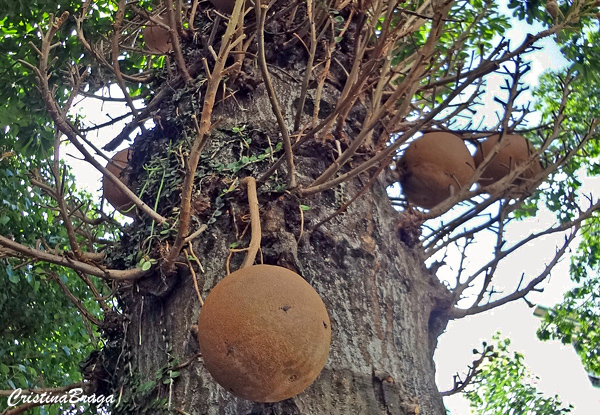 Os frutos são grandes, com cerca de 25 cm de diâmetro e globosos, de casca marrom lenhosa e muito pesados (3 kg). As sementes são oblongas, envoltas em polpa creme que rapidamente torna-se azul ou azulada, quando em contato com o ar, exalam um odor desagradável.