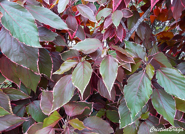 Folhas brilhantes, macias, com bordas serrilhadas e com 10-20 cm de comprimento.