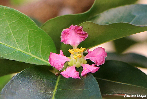 Inflorescências do tipo corimbo e despontam na axilas foliares. As flores são hermafroditas, com pétalas franjadas, de cor rósea-esbranquiçada e dispostas em cachos. Surgem durante o ano todo.