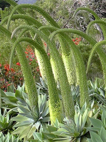 Inflorescência ereta de até 3 metros de altura que emerge do centro da planta, com flores pequenas, que são seguidas por bulbilhos (brotos). Surgem com 8-10 anos de idade.
