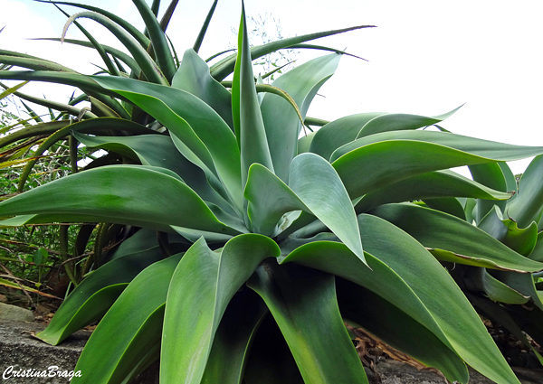 Folhas largo-lanceoladas, verde-acinzentadas, cerosas, suculentas, espessas, formando uma roseta densa.