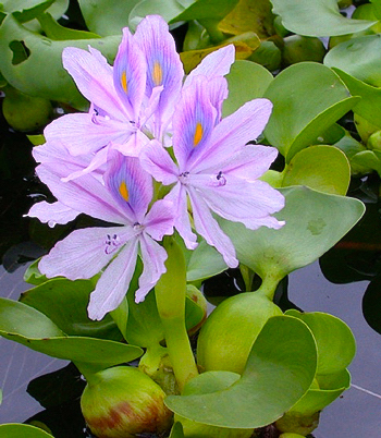 Aguapé – Eichhornia crassipes é uma herbácea, pertence à família Pontederiaceae, nativa da América do Sul, perene, aquática flutuante, o caule é ereto e de até 50 cm de altura.