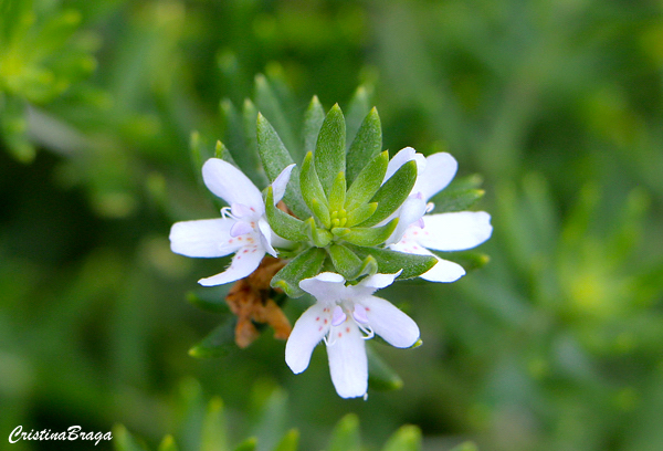 Flores solitárias, esparsas, axilares, de cor branca com perfume discreto, de 2 centímetros de diâmetro. Embora o arbusto nunca fique coberto de flores, elas ficam visíveis em contraste com a folhagem escura. Surgem durante quase o ano todo, com mais intensidade na primavera e verão.