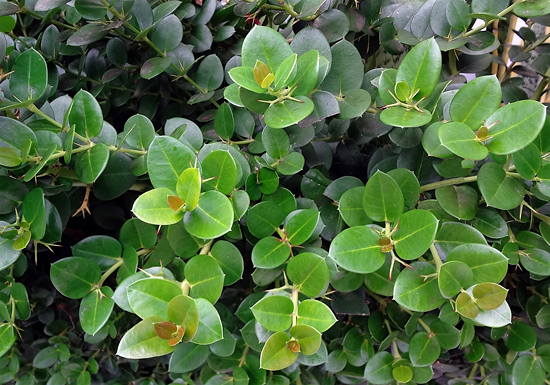 Folhas coriáceas, opostas, suculentas, persistentes, verde-escuras, brilhantes, de 4-7 cm de comprimento, com pecíolo muito curto.