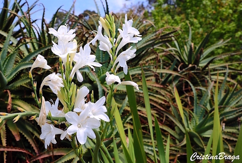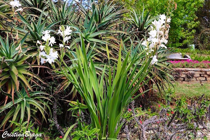 Inflorescências do tipo espiga, em hastes eretas e altas, sobressaindo sobre a folhagem. As flores são cerosas, pequenas, de cor branca com um tom levemente rosado e medem de 4-6 cm de comprimento e podem ser simples ou dobradas. As flores exalam uma fragrância suave durante o dia, mais forte durante a noite e duram cerca de um mês. Surgem na primavera-outono.