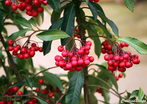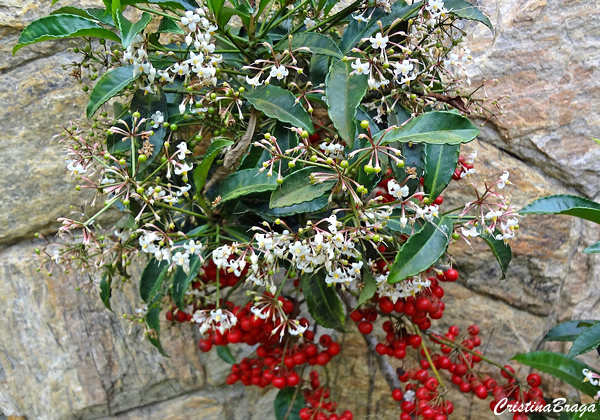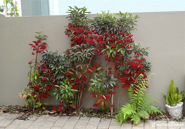 Frutos esféricos em cachos, de coloração vermelho-brilhante e muito duráveis. A planta começa a dar frutos dois anos após a germinação. Surgem do verão até meados do inverno e atraem pássaros.