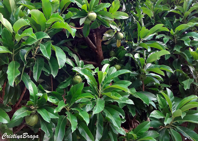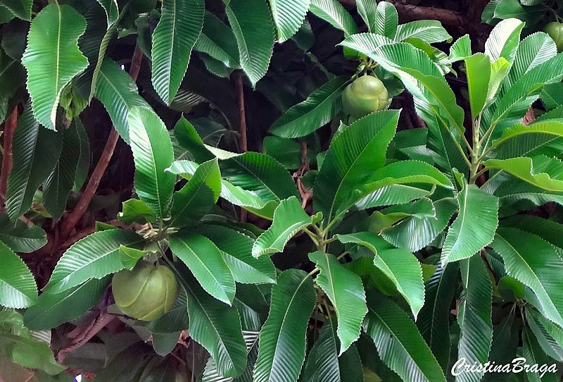 Folhas distribuídas em espiral nos ramos, de cor verde-clara, coriáceas, com nervuras secundárias muito evidentes formando dobras em plissê, com margens dentadas de maneira uniforme.