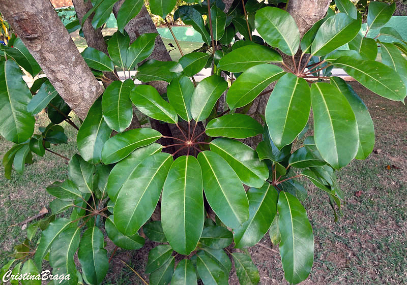 Folhas grandes, compostas, palmadas, glabras, de cor verde escura brilhante e textura semelhante ao couro.