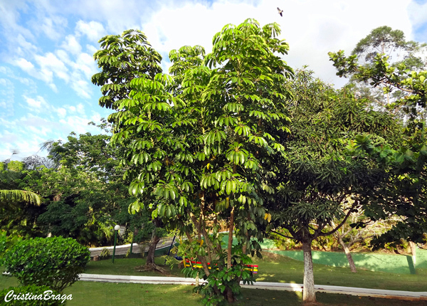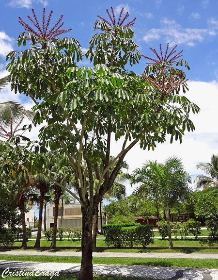 Árvore guarda chuva – Schefflera actinophylla é um arbusto, pertence à família Araliaceae, nativa da Austrália, Indonésia, Java, Nova Guiné e Oceânia, perene, semilenhoso, de 5-7 metros de altura e de folhagem ornamental.