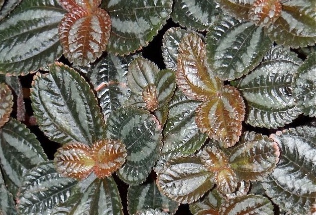 Folhas grandes, largo-ovaladas, profundamente acolchoadas, de cor metálico-bronzeadas com duas faixas prateadas e arroxeadas na face de baixo, de 2-3 cm de comprimento.