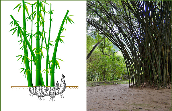 Os bambus seguem basicamente dois comportamentos. Há os que apresentam rizomas leptomorfos que são alastrantes e os com rizomas paquimorfos que formam moitas localizadas.