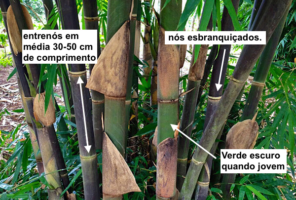 Os entrenós do colmo são de paredes bastante espessas (5-8 mm) e em média 30-50 cm de comprimento. Os colmos são verde-escuros quando jovens e tornam-se preto-púrpura fosco quando maduros com nós esbranquiçados.