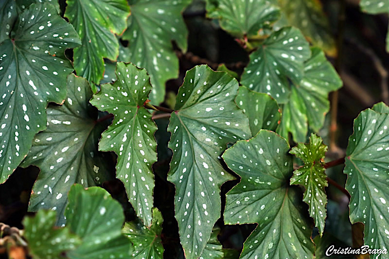Folhas espessas e um tanto recortadas, verde-escuras com pontos prateados e nervação avermelhada.