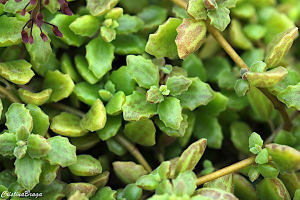 Folhas suculentas, grossas, verdes ou amareladas, com linhas purpuras nas margens. Possui menos de 1,5 cm de comprimento.