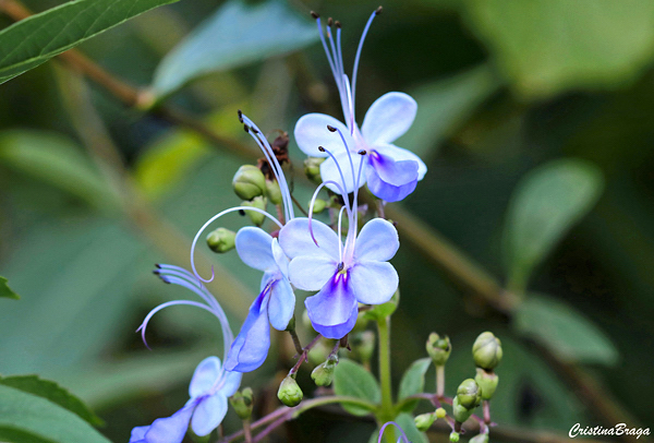 Inflorescências em panículas terminais curtas, localizadas nas pontas das ramificações. Cada flor apresenta quatro pétalas, de cor azul claro e uma pétala de cor azul-arroxeada apontando para baixo. Os longos estames brancos a azulados arqueiam-se sobre as pétalas e servem como plataforma de aterrissagem para os polinizadores. Surgem no decorrer de quase o ano todo e atraem abelhas, borboletas e mamangavas.