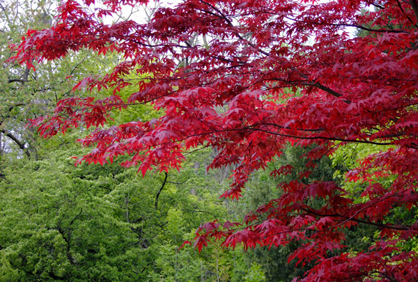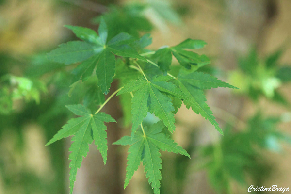Folhas decíduas, palmadas, membranáceas, com de 5-7 lobos acuminados, profundamente marcados e com margens serrilhadas. Na forma típica, as folhas são verdes e adquirem tons dourados a bronzeados no outono.