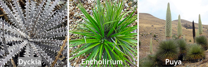 Pitcairnioideae – Estas bromélias são geralmente terrestres, preferindo o solo para estabelecer as suas raízes. São plantas comuns de solos áridos e regiões de grandes altitudes. A maioria das bromélias Pitcairnioidaeae apresentam folhas carnudas e com espinhos muito fortes. Pertencem a essa família, Brocchinia, Connelia, Dyckia, Encholirium, Hetchtia, Navia, Pitcairnia e Puya.