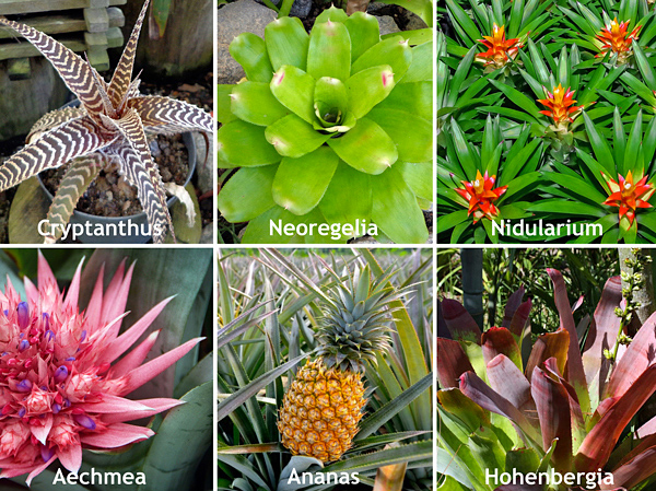 Bromelioideae – Muitas deste grupo são epífitas, das quais algumas se adaptaram em condições terrestres. É a subfamília de bromélias mais cultivada para usos paisagísticos. Pertencem a essa família, Aechmea, Ananás, Billbergia, Canistrum, Cryptanthus, Fernseea, Greigia, Hohenbergia, Neoregelia, Neoglaziovia, Nidularium, Pseudoananas, Quesnelia, Streptocalyx, Wittrockia.