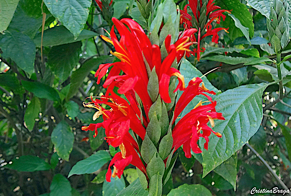 Inflorescências em espigas terminais, com brácteas verdes e flores tubulosas vermelhas. Surgem durante o verão e atraem borboletas e beija flores.
