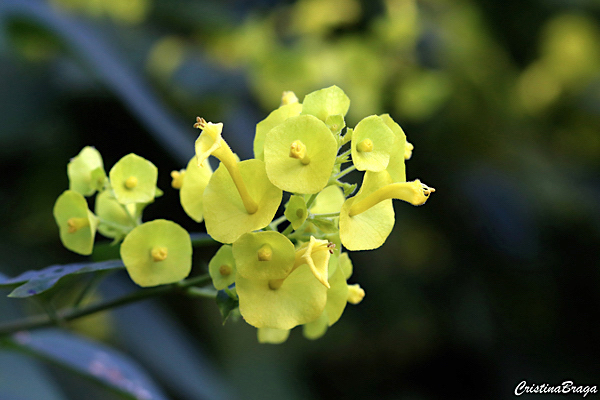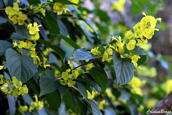 Inflorescências axilares, em racemos curtos. As flores são pequenas tubulosas e com cálice expandido em forma de chapéu, do centro do cálice sai a corola em forma de um tubo. Estas pétalas que formam a corola, caem com muita facilidade, ficando somente o cálice: o “Chapéu chinês”, que dura ainda por varias semanas. Surgem na primavera-verão.