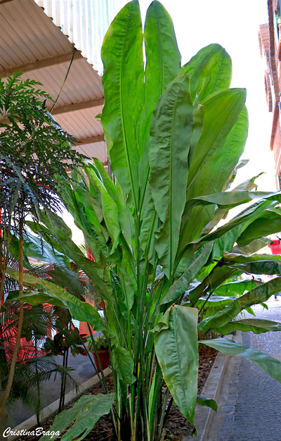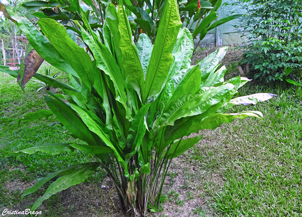 Folhas grandes, de até 1 metro de comprimento, eretas, coriáceas, inteiras ou com um recorte na ponta, dotadas de pecíolo longo, ereto e liso formados a partir da base como um tufo de hastes, de grande efeito ornamental.