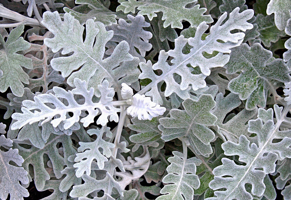 Folhas alternas, pinadas em lobos estreitos e profundamente recortadas, de cor verde prateado com textura aveluda, que a torna de aparência esbranquiçada quando cultivada a pleno sol.