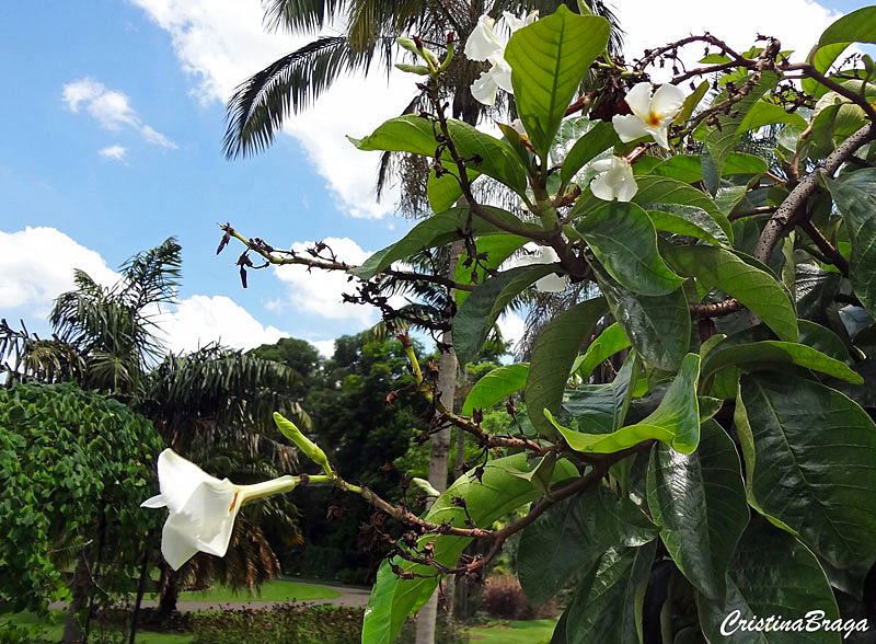 Inflorescências em racemos axilares e terminais, com flores brancas, perfumadas, de corola em forma de funil. Surgem na primavera e verão.