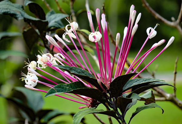 Inflorescências terminais do tipo panícula, densas, com numerosas flores tubulares e longas, semelhantes a cotonetes quando ainda fechadas e que se abrem em cinco pétalas recurvadas, revelando os estames. O cálice das flores é vermelho e a corola pode ser rósea ou branca. Surgem na primavera e atraem borboletas, abelhas e pássaros.