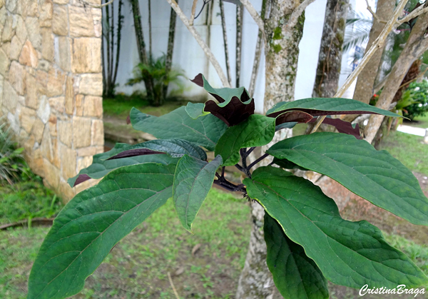 Folhas grandes, opostas, lanceoladas, elípticas a oblongas, pubescentes, com nervuras bem marcadas e margens irregularmente dentadas. Uma característica marcante das folhas é a parte superior verde-escura a levemente azulada e a parte inferior arroxeada, o que torna a planta atraente mesmo quando sem flores. Ocorre ainda uma cultivar de folhas variegadas de amarelo creme.