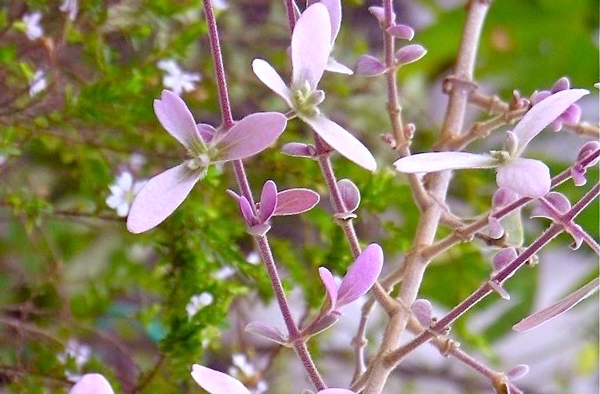 Flores brancas, pequenas e discretas, protegidas por brácteas, que mudam de cor gradativamente, do rosa para o roxo e posteriormente para o cinza, ao longo de várias semanas. Surgem no fim do inverno e durante a primavera.
