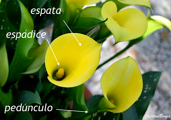 Inflorescências em espádices eretos, com espata em forma de copo, dispostas sobre longos pedúnculos acima da folhagem (60-90 cm), com cores em vários tons de amarelo, vermelho, róseo, roxo e vinho. Surgem na primavera-verão.