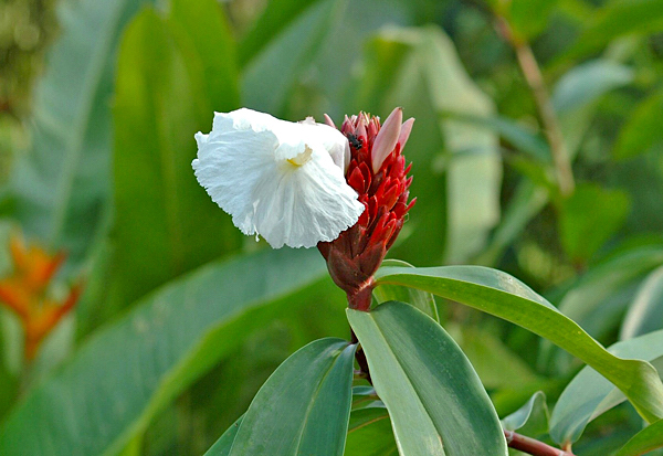 Inflorescências em espigas densas, cilíndricas, terminais, com brácteas vermelho ferrugineas com flores brancas. Surgem quase o ano todo.