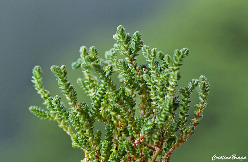 A Crassula muscosa é uma herbácea, pertence à família Crassulaceae, nativa da África do Sul e da Namíbia, perene, suculenta, de crescimento rápido, ramificada e de até 30 cm de altura.