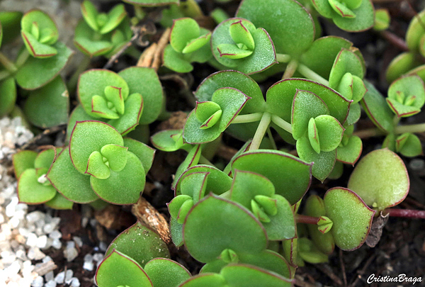 A Crassula pellucida é uma herbácea, pertence à família Crassulaceae, nativa da África do Sul, Cabo Ocidental e Oriental, perene, de crescimento rápido, suculenta, rastejante, de até 15 cm de altura.