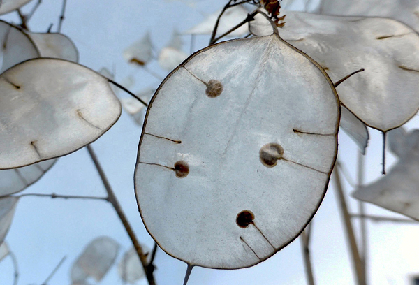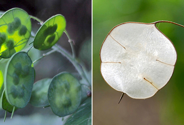Em seguida, surgem os frutos, que medem aproximadamente 3 a 5 cm de comprimento e são do tipo síliqua, deiscentes, membranosos, que são inicialmente verdes. Quando a síliqua está madura e seca, uma válvula em cada um dos lados cai, e as sementes são liberadas, deixando uma membrana central com uma bonita superfície prateada à mostra. Essa membrana pode ficar na planta durante muito tempo, dependendo das intempéries.