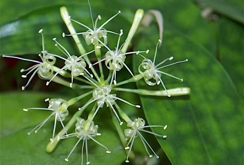 Inflorescências eventuais, de 7-8 cm de comprimento com pequenas flores brancas, agradavelmente perfumadas à noite. Floresce no final do outono e início do inverno.