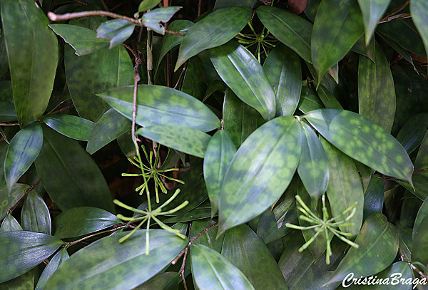 Folhas elípticas, lisas, coriáceas, de cor verde-escura, de 9-20 cm de comprimento. A cultivar Punctulata é mais utilizada no paisagismo, cujas folhas tem manchas esmaecidas de cor verde-amarelada.