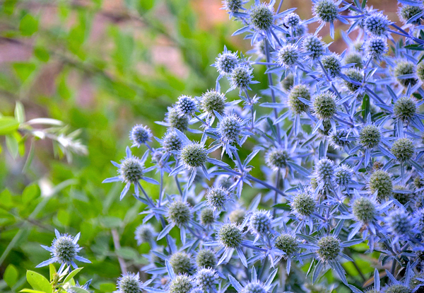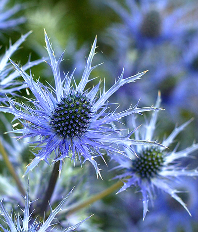 Flores pequenas, terminais, azuis em forma de cone, com brácteas estreitas, espinhosas e de 2,5 cm de comprimento. Surgem no verão e no início do outono e atraem abelhas e borboletas.
