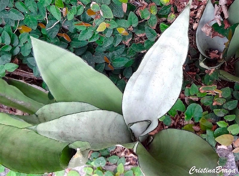 Folhas espessas, coriáceas, dispostas em roseta, curtas, pontiagudas, verde acinzentadas, com faixas transversais irregulares mais escuras.