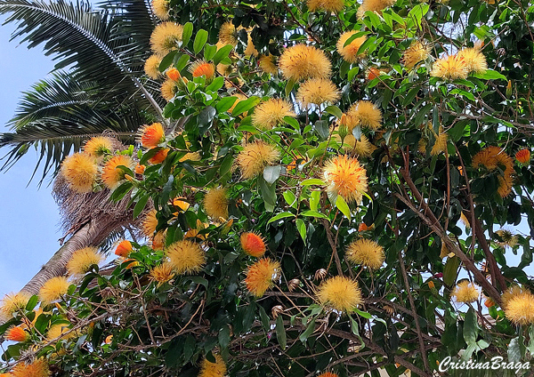 Inflorescências terminais em capítulos grandes, redondos, como pequenos pompons laranja-avermelhado, marcados por estames e pistilos proeminentes. Surgem quase o ano todo, principalmente entre o inverno e o começo da primavera. Atraem muitos beija-flores.