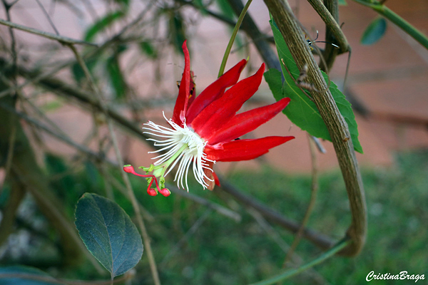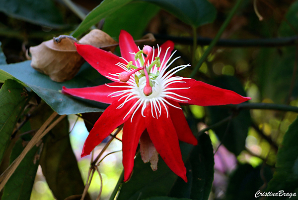 Flores com pétalas e sépalas vermelhas com as bases brancas, com diâmetro de aproximadamente 12 cm, corona com anel da câmara nectífera branco e fímbrias brancas alongadas. As flores apresentam estigmas e estiletes rosados, ovários, filetes e anteras verdes. Surgem quase o ano todo, com maior intensidade de junho a novembro.
