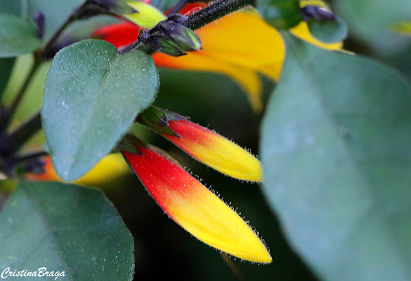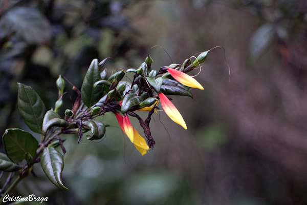 Flores em toda a ramagem, são tubulares, com 2,5-3 cm de comprimento, de cor vermelha com a extremidade amarela. Surgem no inverno-primavera e atraem beija-flores.