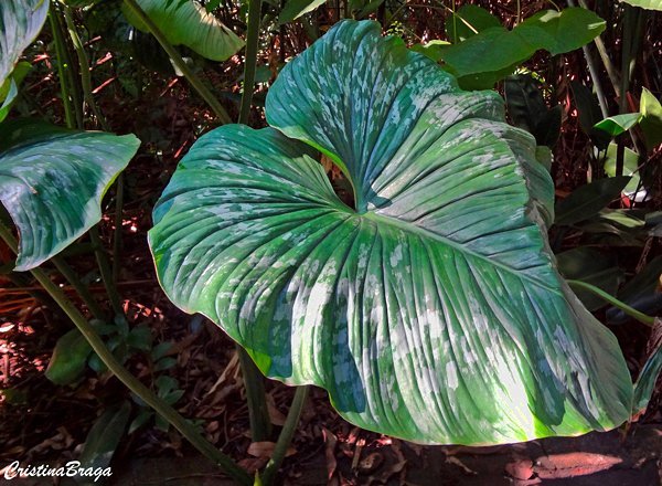Folhas verde-azuladas, brilhantes, com a face superior manchada de prateado e a face inferior com nervuras avermelhadas, sustentadas por um pecíolo rosado. Os padrões prateados as tornam completamente únicas, portanto nenhuma folha tem a mesma aparência.