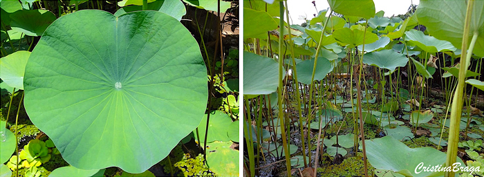 Folhas grandes de até 60 cm de diâmetro, arredondadas que se projetam acima da superfície da água, chegando a alcançar até 1,50 cm de altura. São apoiadas por longos pecíolos cilíndricos, numa conformação semelhante a de um guarda-chuva invertido.