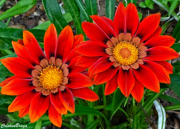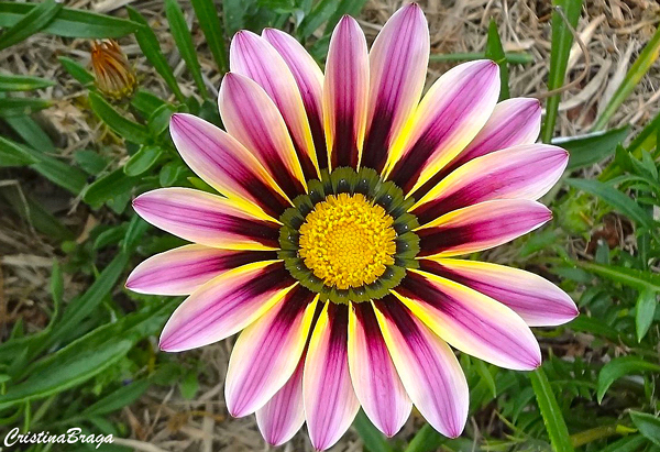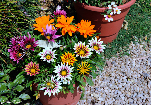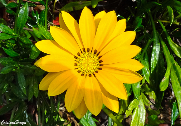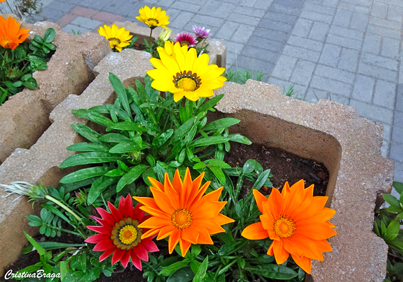 Gazânia – Gazania rigens é uma herbácea, pertence à família Asteraceae, nativa da Africa do Sul, perene, com 15-20 cm de altura, muito florífera e de folhagem densa.
