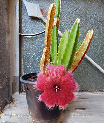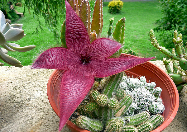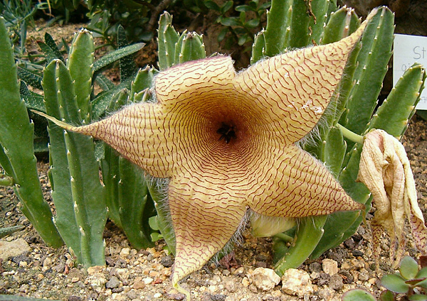 As flores são em forma de estrela, com cinco lóbulos e podem ser vermelhas, roxas ou amarelas, geralmente com padrões interessantes de faixas. Essas flores são extremamente variáveis em tamanho, que podem ser de 6 mm a 40 cm de diâmetro. A maioria das flores de Stapelia são visivelmente peludas e cheiram a carne podre quando florescem, dando origem ao seu nome comum de “flores carniceiras”.
