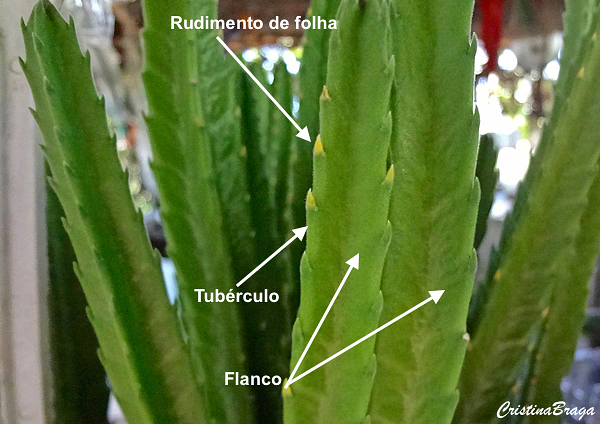 Caules suculentos, angulares e verdes, no entanto a pleno sol desenvolvem uma cor avermelhada, possuem hastes de 4 ângulos, que variam de 5 mm a 5 cm de diâmetro.