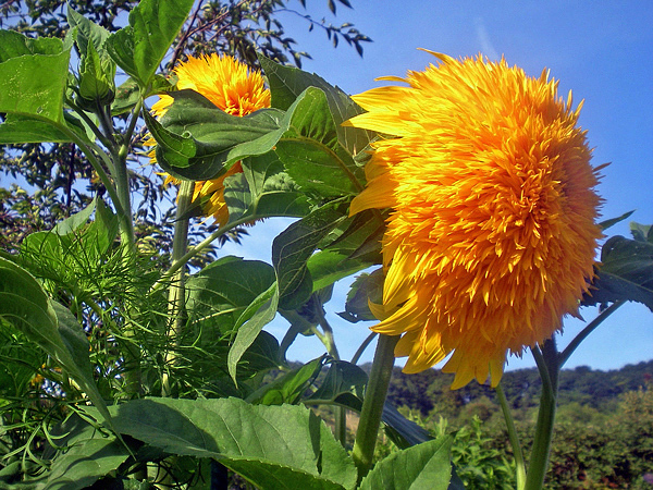 Inflorescências grandes do tipo capítulo, de cor amarelo ouro e dobradas que passam dos 10 cm de diâmetro. Surgem 60 dias após o plantio e atraem abelhas e borboletas.