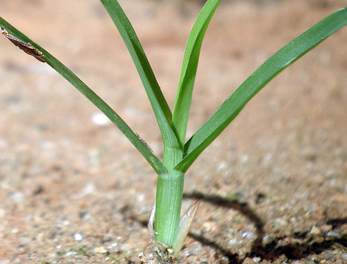 As gramíneas têm caules ocos, exceto nos nós, e folhas alternadas estreitas, sustentadas em duas fileiras. A parte inferior de cada folha envolve o caule, formando uma bainha foliar. A folha cresce a partir da base da lâmina, uma adaptação que lhe permite lidar com pastagens frequentes.
